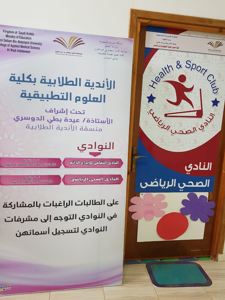 بتوجيه من مشرف كلية العلوم الطبيه التطبيقية بوادي الدواسر الدكتور ماجد علي الشريدة واشراف مشرفة الأندية. أ/عيده بطي ومشرفة النادي الرياضي أ/رفعه عبدالرحمن تم بحمد الله افتتاح النادي الرياضي بكلمة لمشرفة الأندية تحدثت فيها عن أهمية الانشطة الطلابية بصفه عامة والأنشطة الرياضية بصفه خاصة للصحة الجسمانية والنفسية بماتمثل محورا هاما من محاور بناء الشخصية المتكاملة للطالبات وأهمية الرياضة للطالبات وان الرياضة هي وسيلة الحصول على جسد سليم معافي كما أنها وسيلة للتخلص من الأمراض وقد ذكرت أهمية الرياضة في الإسلام. حيث تم التجول داخل النادي و تفعيل الأجهزة المتاحة به والاطلاع على أ هداف ومحتوي برنامج النادي الرياضى الذى أ عد بهدف الترويح عن منسوبات الكلية من طالبات وأعضاء هيئة التدريس وموظفات وتقديم الخدمات الرياضية بهجة وبساطة وفن وترويح ورياضة بهذا العبارات يمكن وصف النادي الرياضي في الكلية .وقد كانت لنا الرياده في إنشاء هذا النادي الرياضي كاول نادي لكلية طالبات في جامعة الامير سطام بن عبدالعزيز.