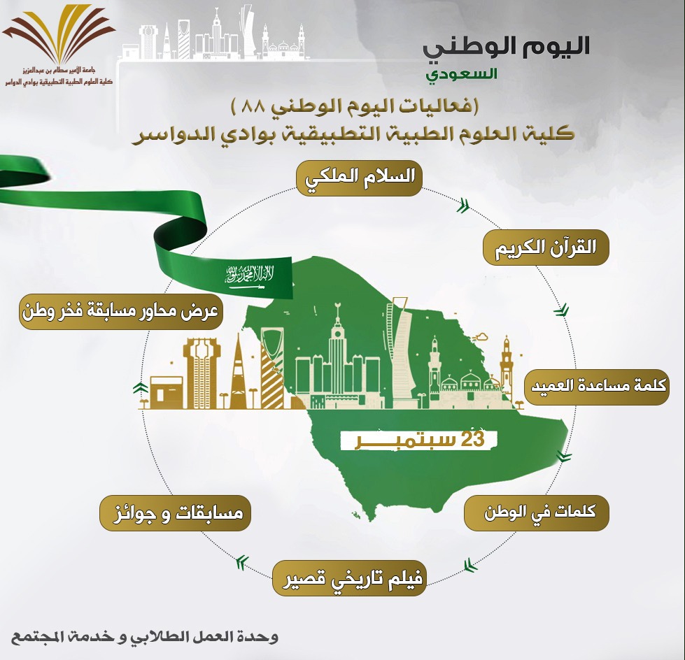 احتفلت كلية العلوم الطبية التطبيقية يوم الأربعاء الموافق 16/1/1440 باليوم الوطنى 88 برعاية سعادة مشرف الكلية د.ماجد بن علي الشريدة واشراف من وحدة العمل الطلابى وخدمة المجتمع حيث تضمن اليوم فعاليات مختلفة بدأت بالنشيد الملكى وقراءة آيات من القران الكريم ثم القت سعادة الدكتورة ماجدة الجميل مساعدة العميد كلمة بهذة المناسبة قامت بتهنئة الطالبات باليوم الوطنى للمملكة وحثهن على الجد والإجتهاد وبذل العطاء والعمل على رفعة وتقدم الوطن ،ثم تم تقديم فيلم تاريخى قصير عن المملكة وعمل مسابقات ثقافية مع توزيع جوائز للطالبات، وعرضت سعادة الدكتورة مشرفة الأنشطة الطلابية وخدمة المجتمع د.هيام أحمد محاور مسابقة "فخر وطن" التى تنظمها عمادة شؤون الطلاب شطر الطالبات وتكلمت عن شروط وضوابط المشاركة مع توزيع نسخ ورقيه للتوضيح.