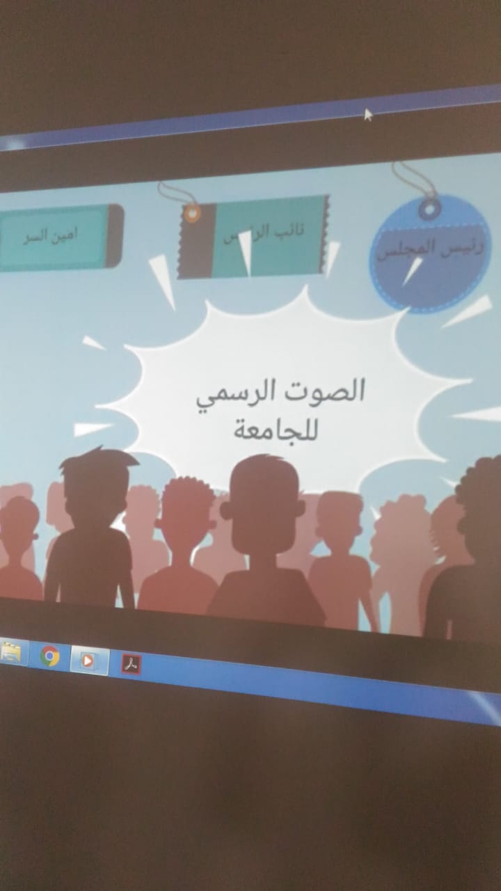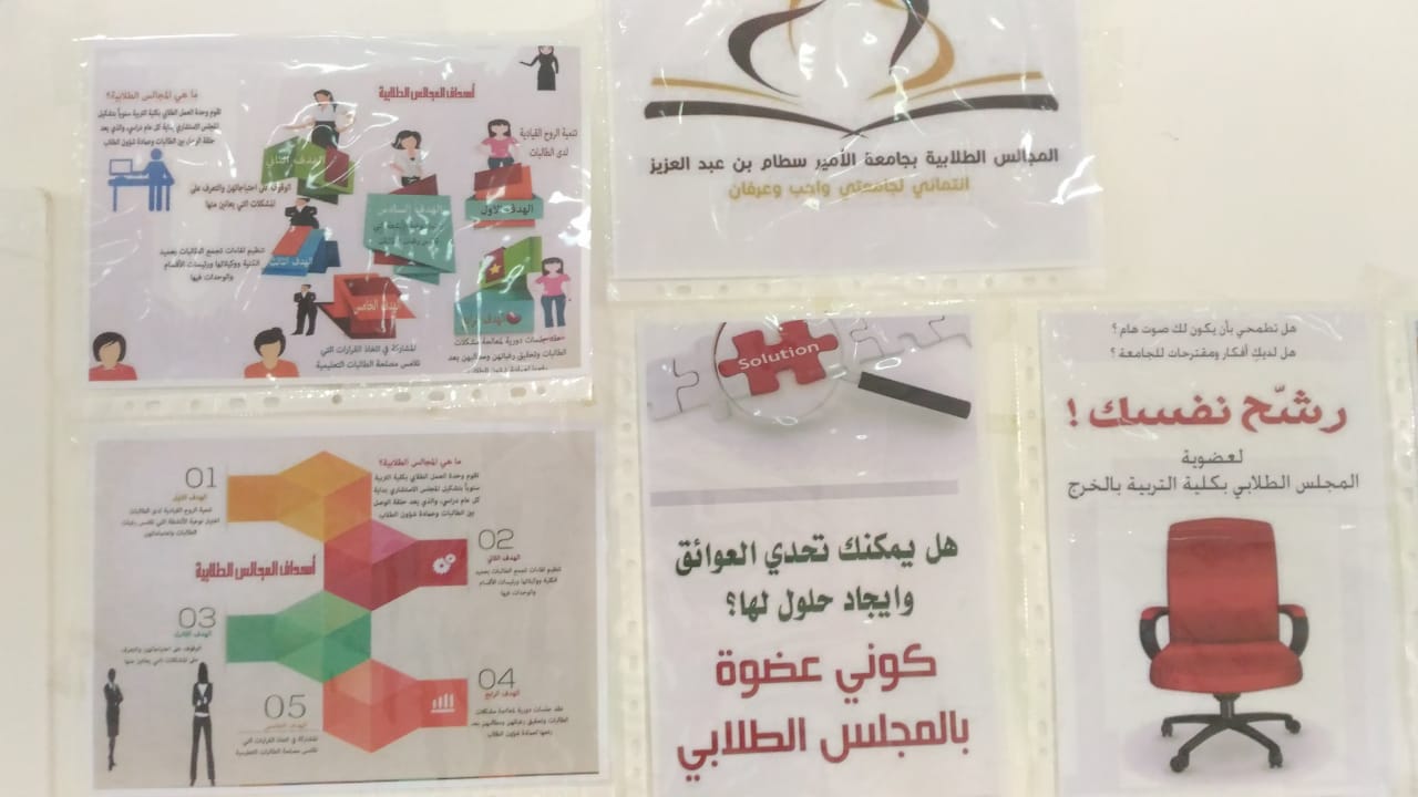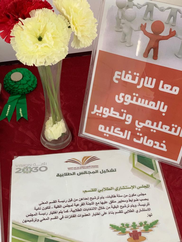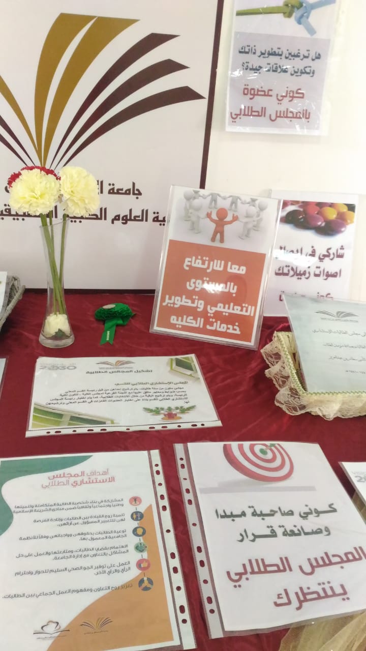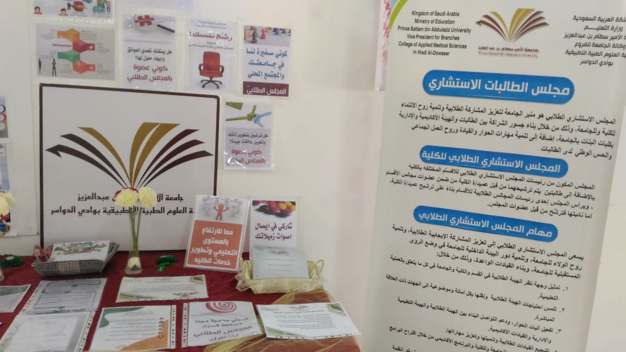 تحت رعاية المشرف على كلية العلوم الطبية التطبيقية بوادى الدواسر د/ماجد على الشريدة وبحضور مساعدة العميد لشؤون الطالبات د/ماجده الجميل قامت وحدة العمل الطلابى على مدار يومين الثلاثاء- الأربعاء الموافق ٢٥-٢٦ / ١ / ١٤٤١ بتنظيم حملة تعريفية بالمجلس الاستشارى الطلابى للطالبات بساحة الكلية تضمنت شرح أهداف ومهام وإجراءات تشكيل المجلس الطلابى وشروط الترشيح وآلية العمل كما تم عرض فيديو مع توزيع منشورات للتوضيح بالاضافة الى الركن التعريفى الذى يحتوى كل المنشورات والدعاية الازمة للترشيح لعضوية المجلس