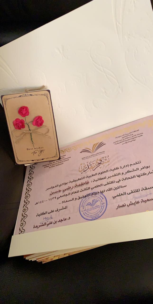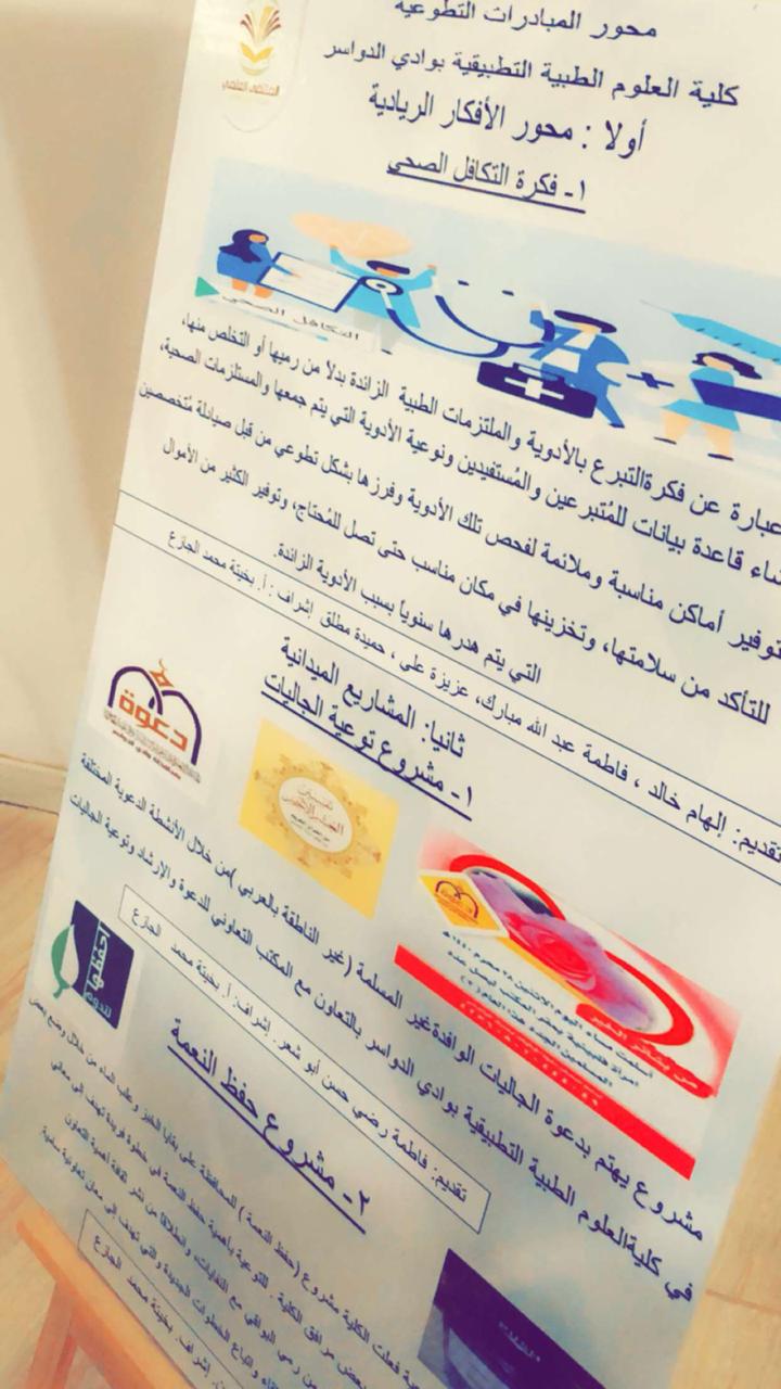 بتوفيق من الله وتحت رعاية سعادة مشرف الكلية د.ماجد بن على الشريدة اقيم اليوم اللقاء التحضيرى للملتقى العلمى الثالث بكلية العلوم الطبية التطبيقية بوادى الدواسر بحضور كريم للجنة الاشراف العام على الملتقى واقيم اللقاء والمعرض بمسرح الكلية وبدا البرنامج بالسلام الوطنى السعودى ثم تلاوة ايات من الذكر الحكيم لاحدى الطالبات ثم كلمة سعادة الدكتورة دلال المطرفى للطالبات كما تفقدت اللجنة المعرض المقام على هامش اللقاء والذى تضمن اركان للابحاث والمبادرات والافلام التوعوية واثنت على اعمال وافكار المشاركات.كما تضمن اللقاء كلمةترحيب منسقة الملتقى ومساعدة العميد للشؤن التعليمية والاكاديمية ثم عرض لكل اعمال الدعاية والتعريف بالمحاور المختلفة وورش العمل لمختلف المحاور وكذلك تشكيل لجان تحكيم المحاور والتنظيم والدعاية للملتقى ثم عرض اسماء الاعمال التى تم تحكيمها للمشاركة.وقامت اللجنة بتكريم الطالبات المشاركات وتوزيع الشهادات والهدايا عليهم.كما تم تكريم اعضاء هيئة التدريس المشرفات والمنظمات واعضاء لجان التحكيم.