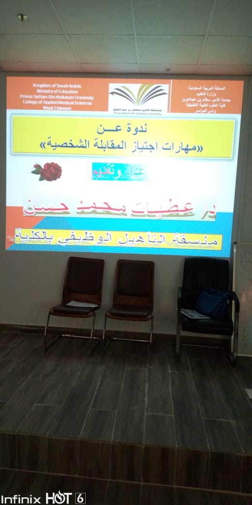 اقامت وحدة الخريجين متمثلة في التاهيل الوظيفي ندوة للطالبات بعنوان "مهارات اجتياز المقابلة الشخصية" وذلك يوم الاحد الموافق ١٣/٣/١٤٤١ الساعة التاسعة صباحا للطالبات المتوقع تخرجهم بقسم المختبرات بقاعة دراسية B-10 بالكلية وكذلك يوم الثلاثاء الموافق ١٥/٣/١٤٤١ الساعة الثانية عشرة ظهرا لطالبات الامتياز (الخريجات) بقاعة المحاضرات بمستشفي وادي الدواسر العام. وقد قدمت الندوة يومي الاحد والثلاثاء دكتورة عطيات محمد حسن منسقة التاهيل الوظيفي بالكلية وهدفت الندوة الي تطوير مهارات اجتياز المقابلة الشخصية وتضمنت اهدافها علي مفهوم المقابلة الشخصية واهميتها، اسرار النجاح للحصول علي وظيفة، كيفية التحضير والاستعداد للمقابلة، الاخطاء الشائعة في المقابلات لتفاديها، نصائح من مسؤول التوظيف في جول لتكسب بها اي مقابلة عمل. تم طباعة الفاعلية واعطاء الطالبات نسخة ورقية منها، وقد ابدي الطالبات اعجابهم واهتمامهم بمثل هذا النوع من الفاعليات.