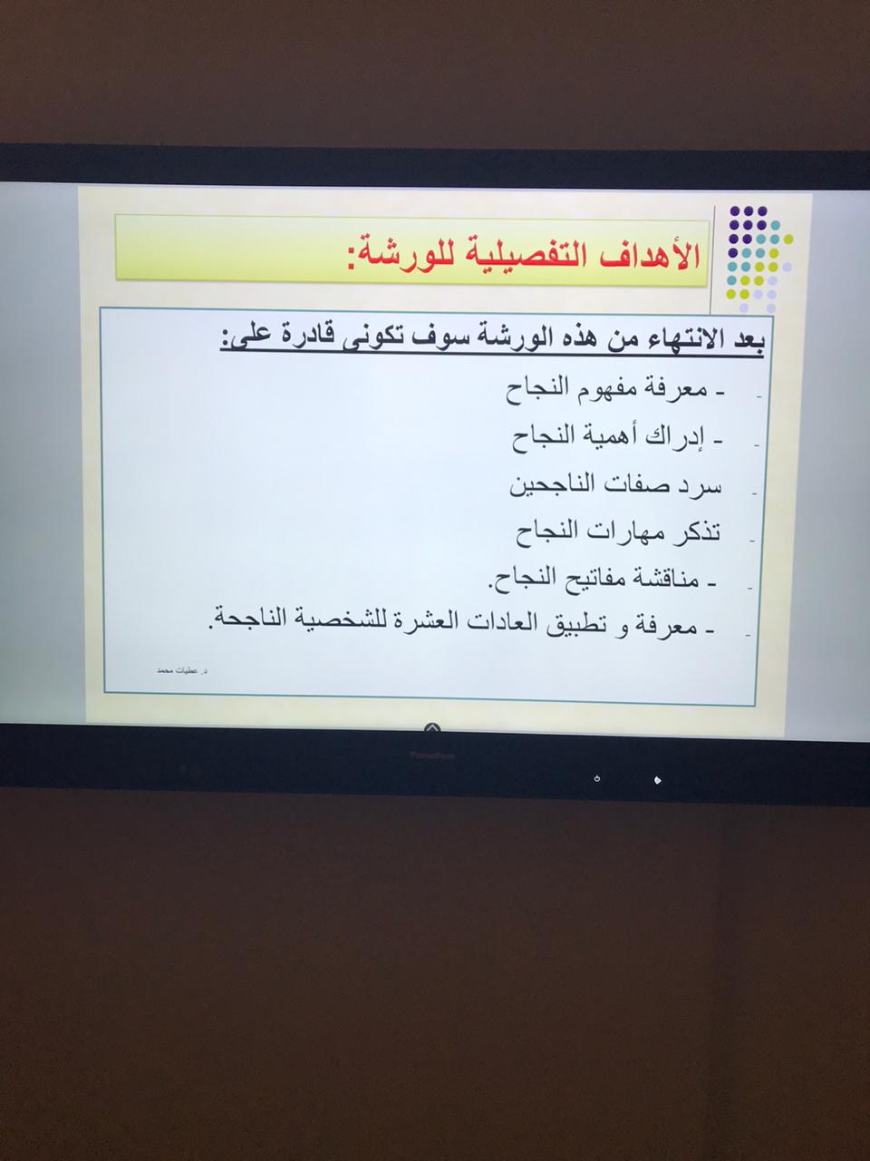 تزامنًا مع قرب الامتحانات الفصلية الأولي وحرصا من الكلية علي إكساب الطالبات المهارات والخبرات المختلفة لزيادة وعيهن و اندماجهن مع الحياة الجامعية، أيضًا حصولهن علي أفضل النتائج بأذن الله أقامت وحدة التوجيه والإرشاد الطلابي بالتعاون مع وحدة العمل الطلابي ممثلة في البرامج التطوعية ورشة تدريبية للطالبات بعنوان "مهارات النجاح" وذلك يوم الثلاثاء الموافق ٢٤/٦/١٤٤١ هـ بقاعة دراسية C10 الساعة الواحدة والنصف ظهرًا. وقد هدفت الورشة الي إكساب الطالبات مقومات الشخصية الناجحة وذلك من خلال توضيح مفهوم النجاح، أهمية النجاح، مواصفات الناجحين، مهارات النجاح، و معرفة وتطبيق العادات العشرة للشخصية الناجحة. مع تمنياتنا لجميع الطالبات بالتوفيق والسداد.