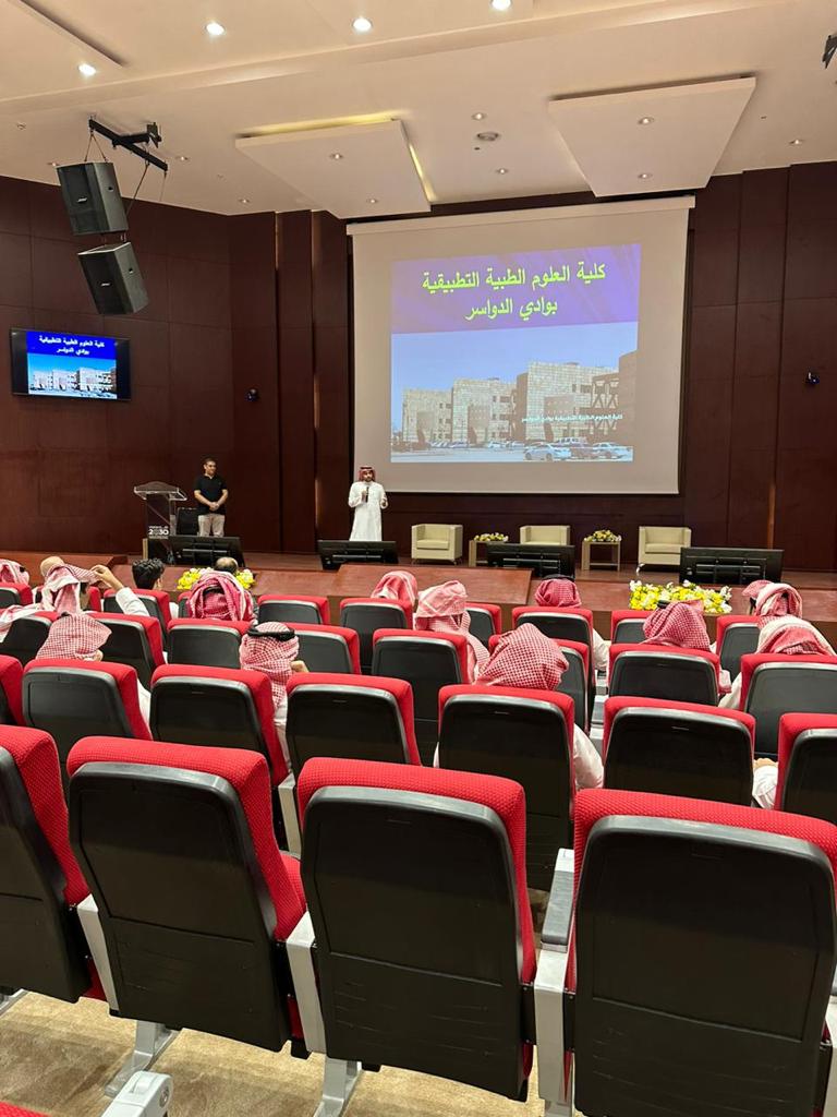 Under the supervision of His Excellency the Dean of the College of Medical and Applied Sciences in Wadi Al-Dawasir Governorate, Dr. Ali bin Abdullah Al Bazie, the College held an introductory and guidance meeting program for new students for the academic year 1445 AH on Wednesday 14/02/1445 AH corresponding to 31/8/2023 AD at the Colleges Complex Theater in Wadi Al-Dawasir Governorate for the male section at 12 noon. The meeting began with the speech of Dr. Mubarak bin Abdullah Al-Dosari, Vice Dean for Educational and Academic Affairs, to introduce students to the bachelor's program in nursing sciences.