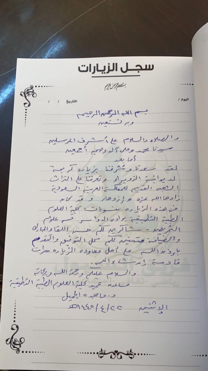 In an effort by the college to enrich the knowledge and cultural aspect of the employees of the College of Applied Medical Sciences in Wadi Al-Dawasir, female section, the college organized a visit to the Social Activity Center in Al-Zuwayra district in the governorate on Monday, 22/4/1445 AH. Dr Magda Mahmoud Gemayel, and a number of faculty employees participated in the visit. During the visit, the museum's collections, antiquities and ancient tools were reviewed, accompanied by a detailed explanation from the center's employees.